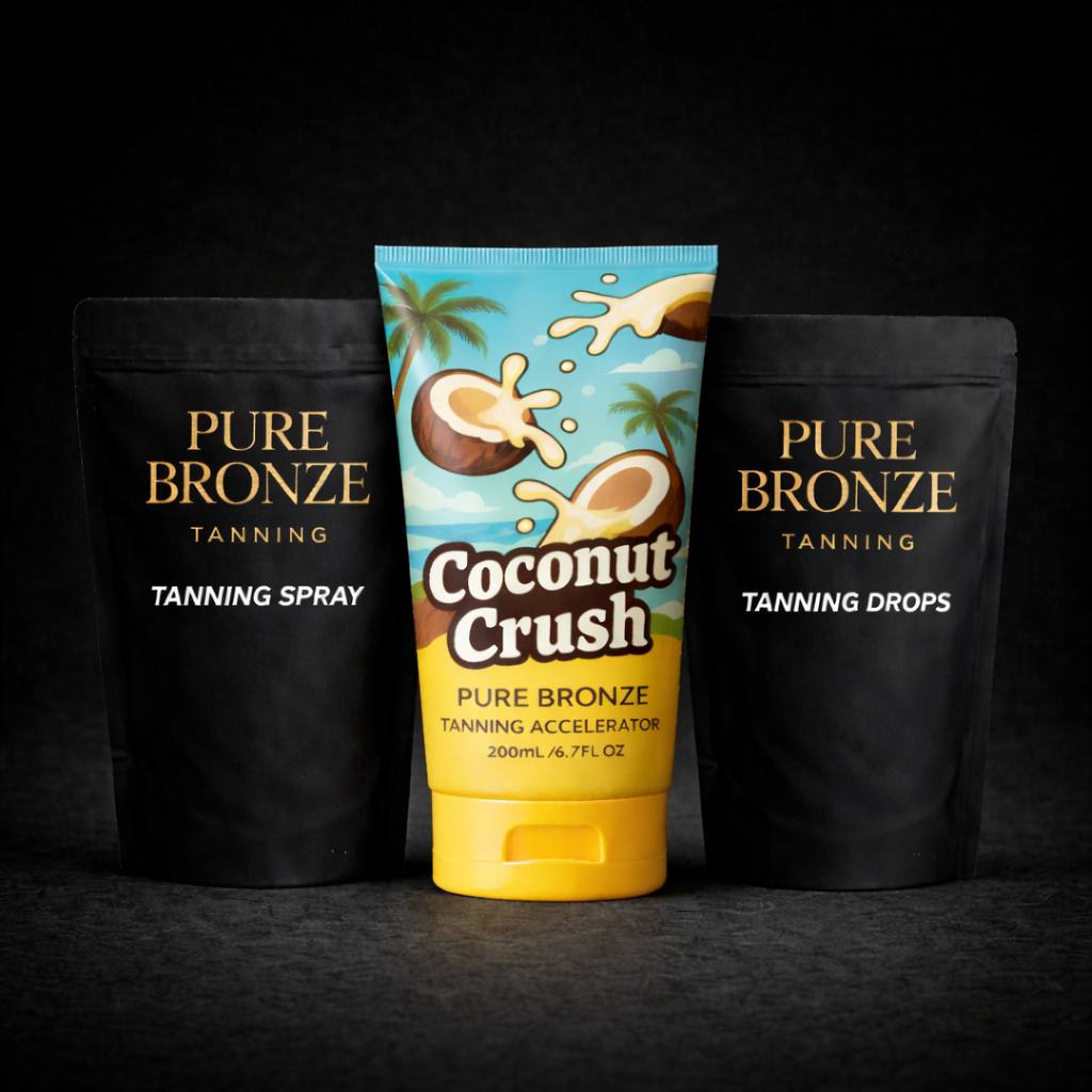Combining our Tanning Spray, Tanning Drops, and Coconut Crush™ Accelerator, this advanced trio is designed to support your natural tanning process while helping you achieve richer, more even results.